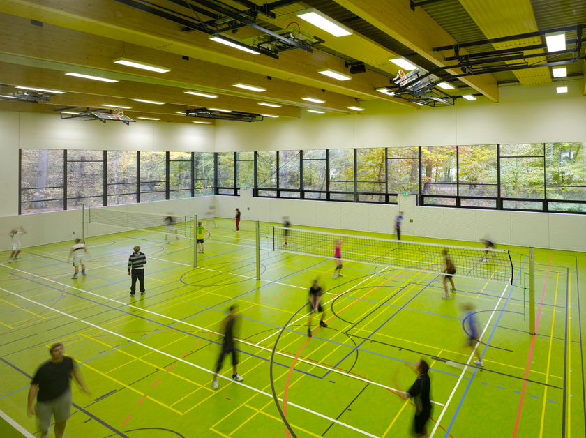 Inmitten des dicht gewachsenen Hardtwaldes entstand auf dem Campus Süd des KIT, Karlsruher Institut für Technologie eine neue Dreifeldsporthalle für das Institut für Sportwissenschaften.